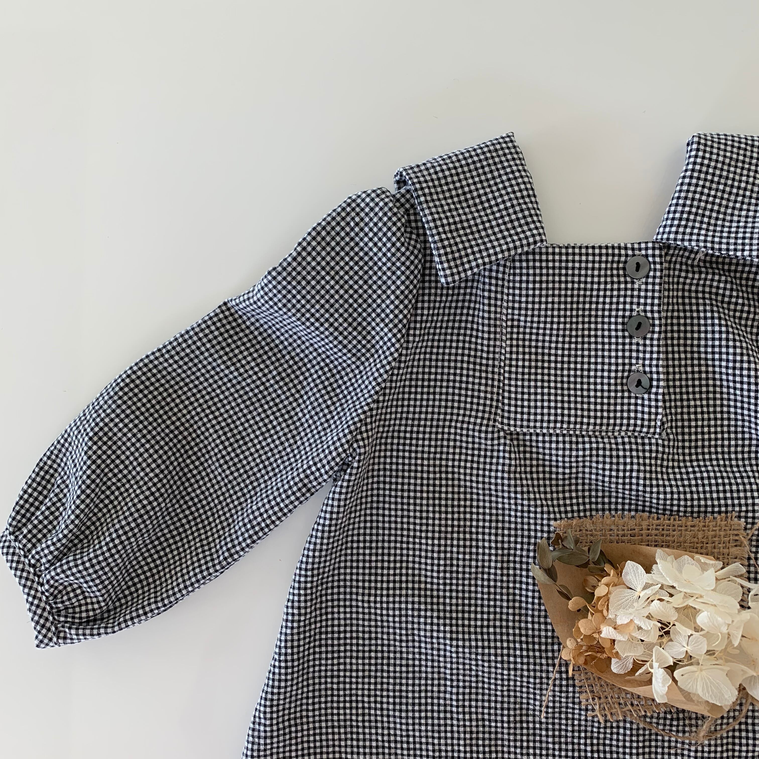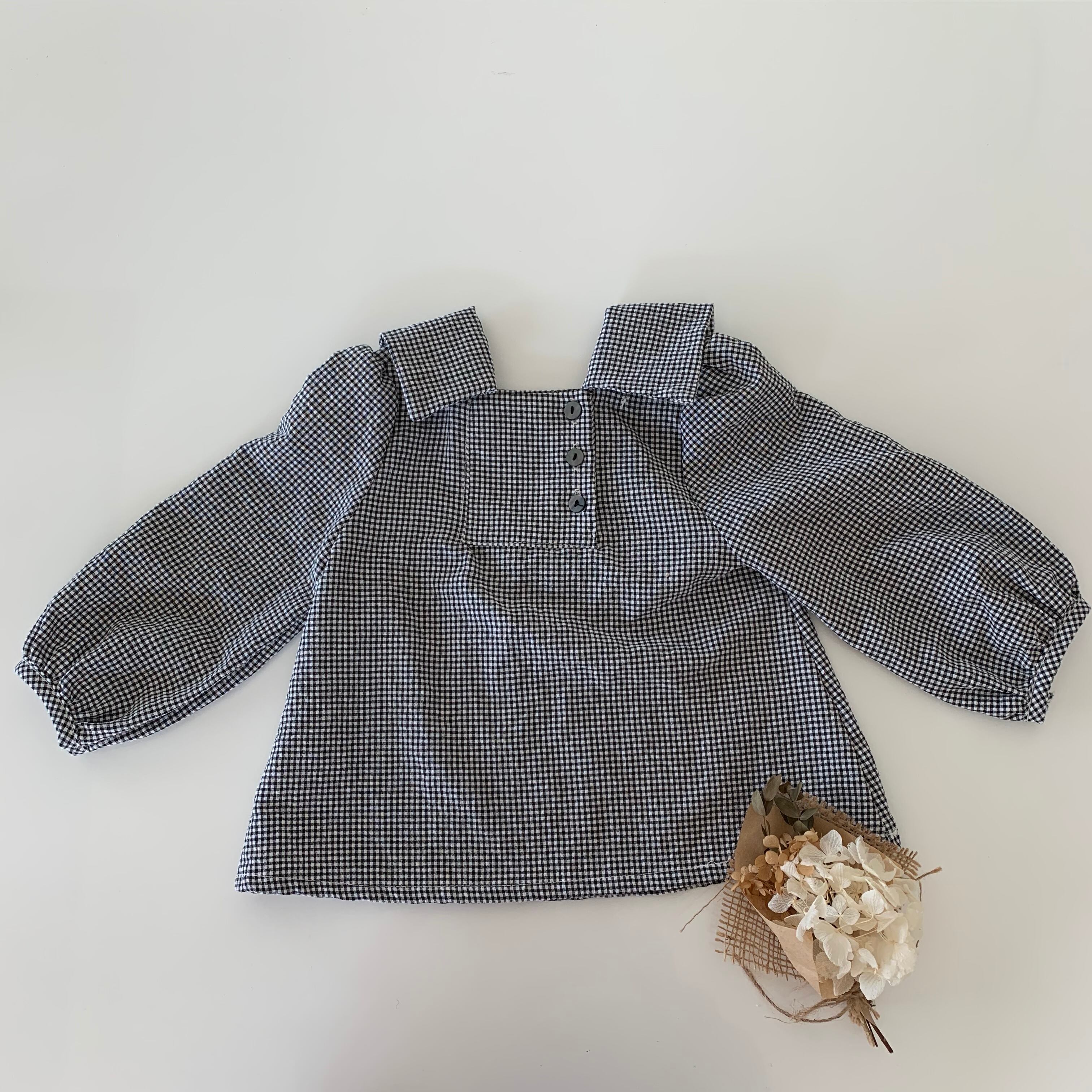 チェック柄 デザイン襟ブラウス (ブラック)/¥2800